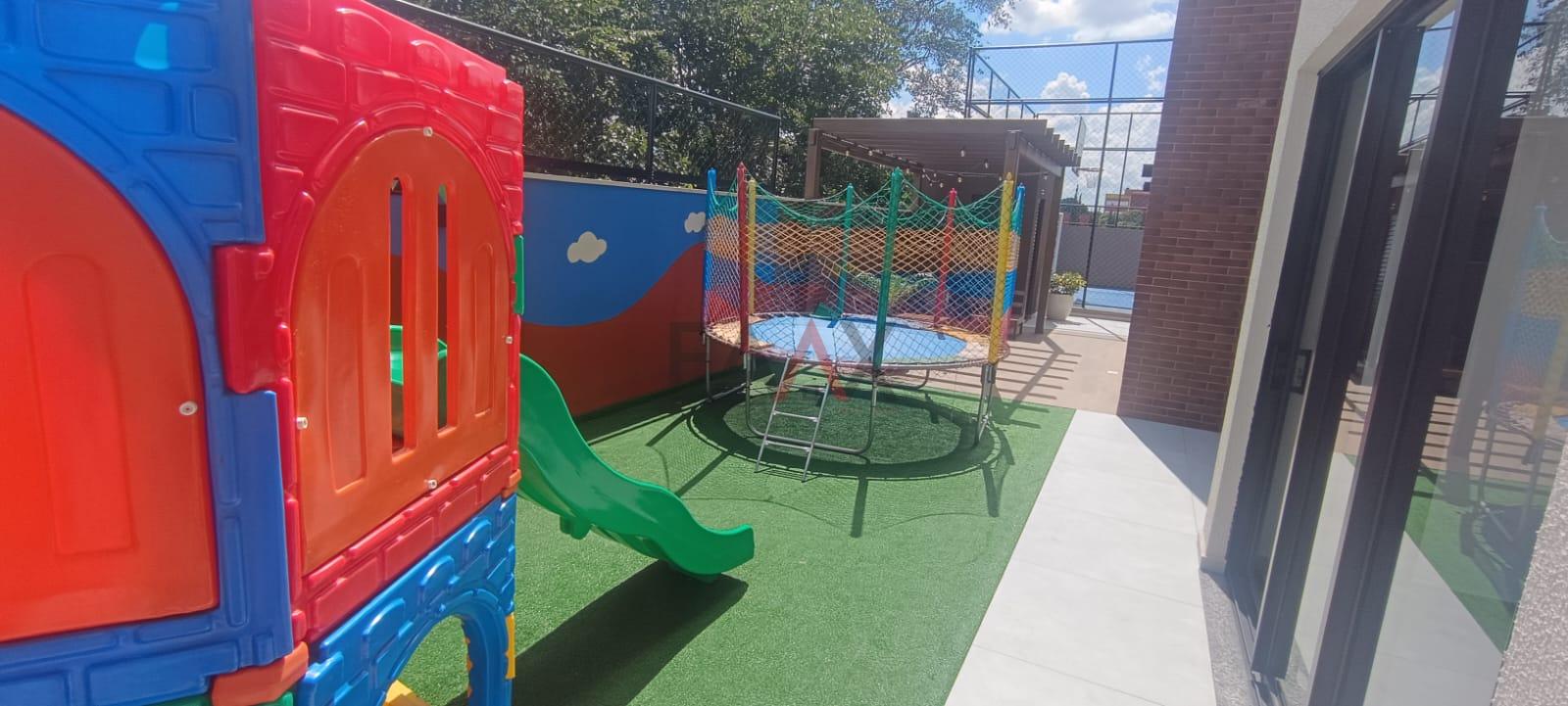 Condomínio com piscina, quadra de esportes, playground, academia e salão de festas.