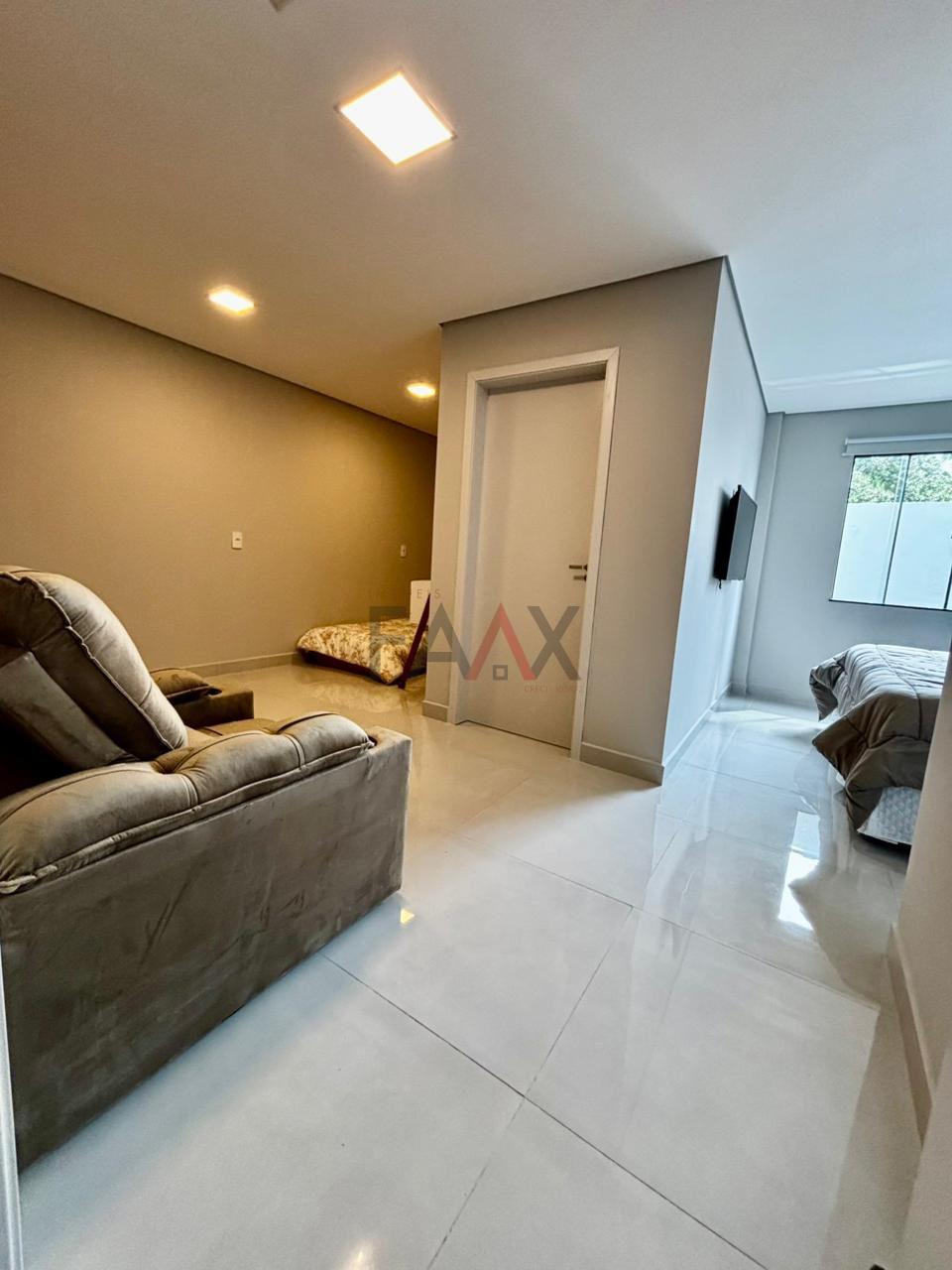 A casa da frente, em fase de acabamento, conta com 3 quartos, sendo uma suíte, sala de TV, cozinha em conceito aberto integrada à sala de estar e banheiro social, oferecendo um ambiente moderno e funcional.